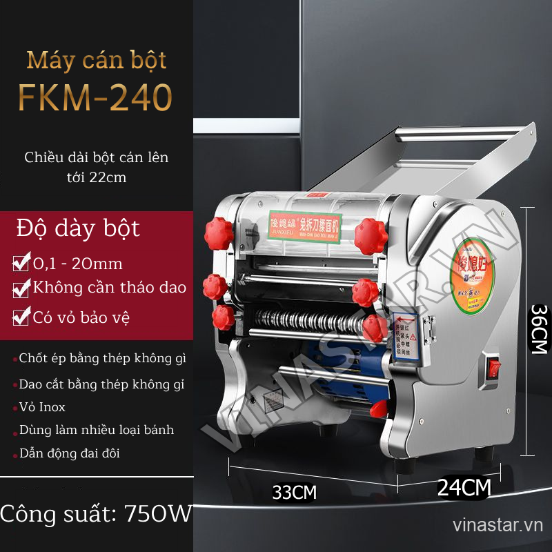 Máy FKM-240 sở hữu khung máy chắc chắn, kiểu dáng gọn gàng, phù hợp với không gian bếp gia đình 🍳 hoặc các cơ sở kinh doanh nhỏ 🏪. Trục lô cán bột rộng 24cm cho phép cán mỳ thành những tấm bột mỏng đều, đạt độ dày từ 0.1mm – 20mm, giúp bạn linh hoạt chế biến nhiều loại mỳ khác nhau, từ mỳ trứng 🥚, mỳ gạo 🍚 đến mỳ tươi truyền thống.