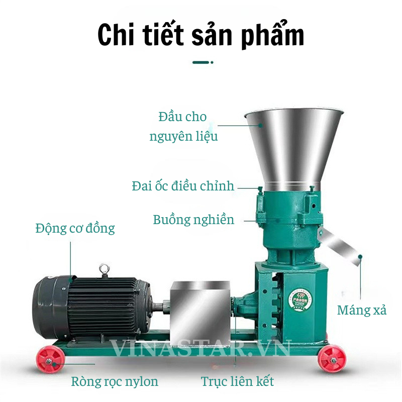 - Nguyên lý hoạt động: Nguyên liệu sau khi được nghiền nhỏ sẽ được đưa vào máy, dưới tác động của lực ép từ trục và nhiệt độ ma sát, nguyên liệu sẽ được nén chặt và tạo thành các viên cám. Các viên cám sau đó sẽ được đẩy qua sàng ép và rơi ra ngoài.