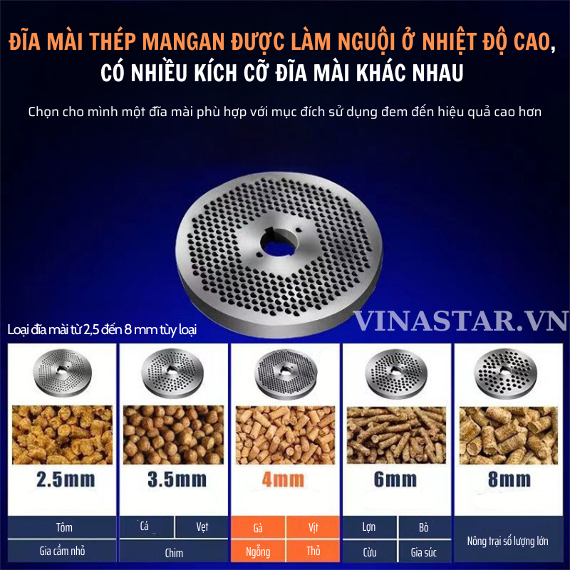 - Sàng ép: Có nhiều kích thước lỗ khác nhau để tạo ra các viên cám có đường kính khác nhau.