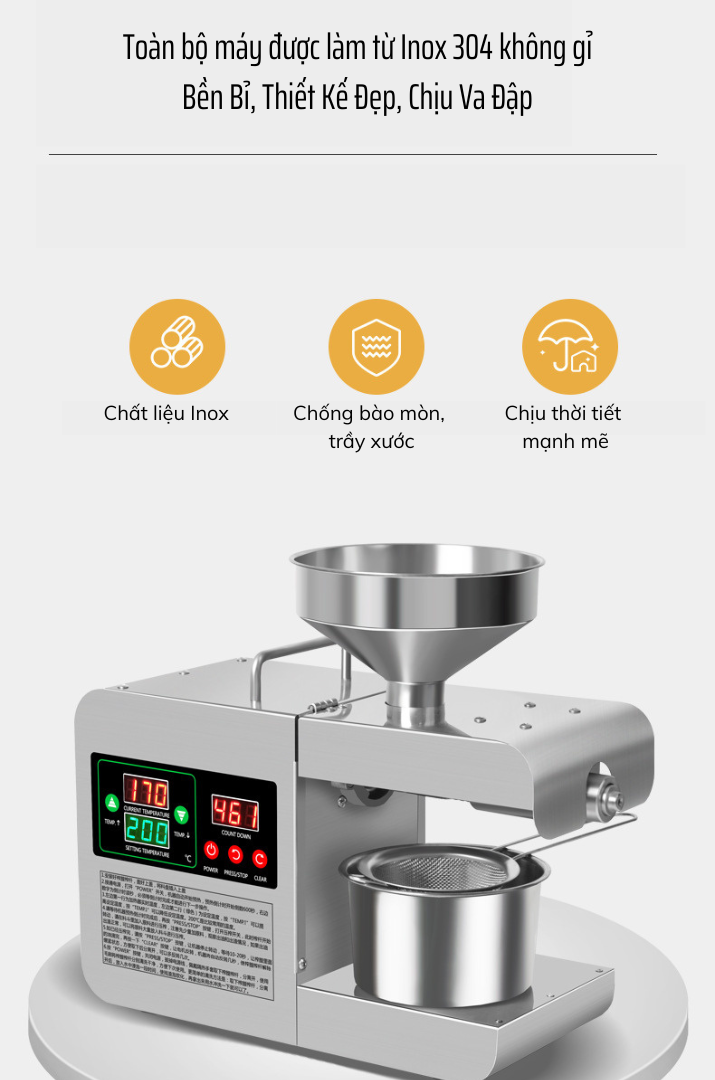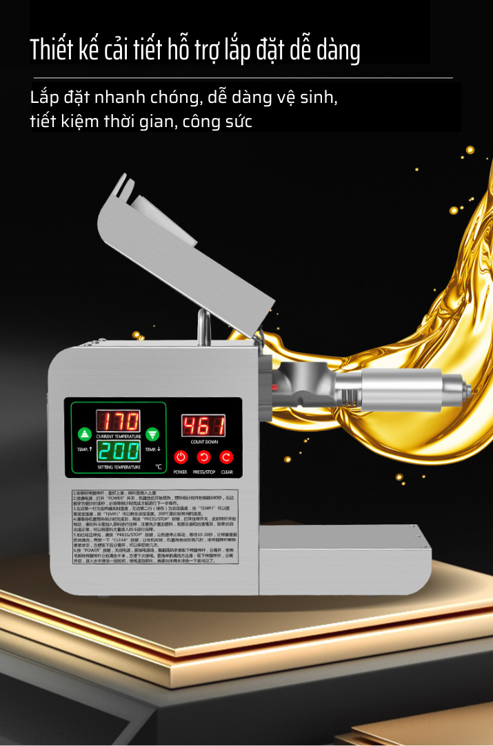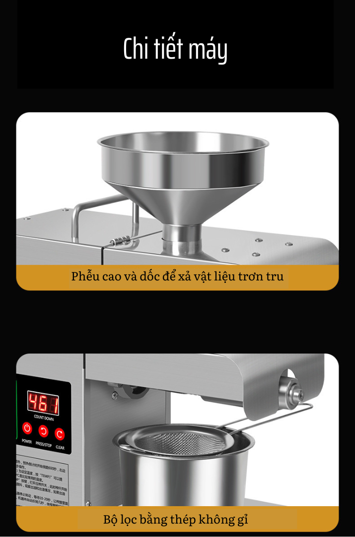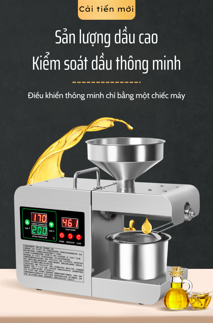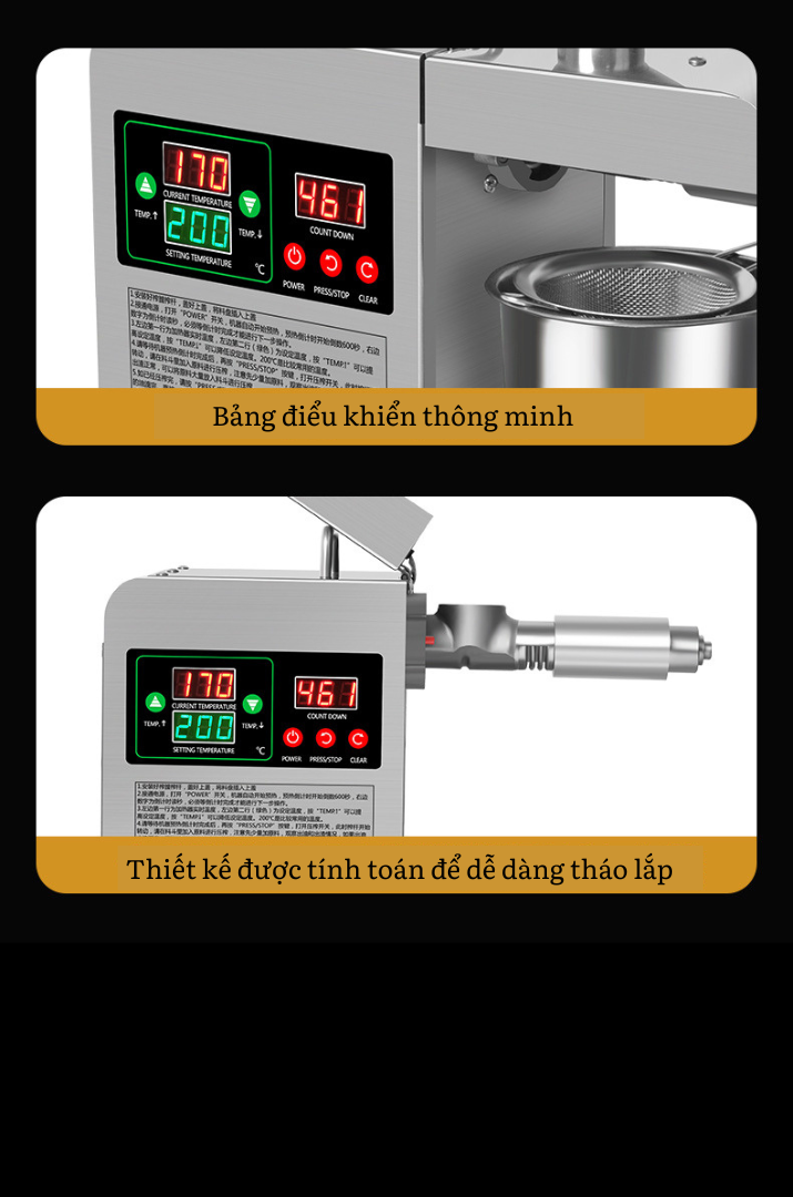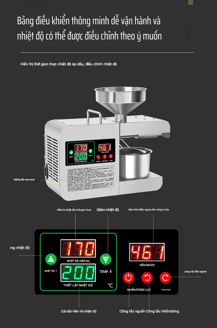 Màn hình kỹ thuật số thông minh: Giúp bạn dễ dàng điều chỉnh nhiệt độ theo từng loại nguyên liệu, đảm bảo hiệu suất ép và chất lượng dầu.