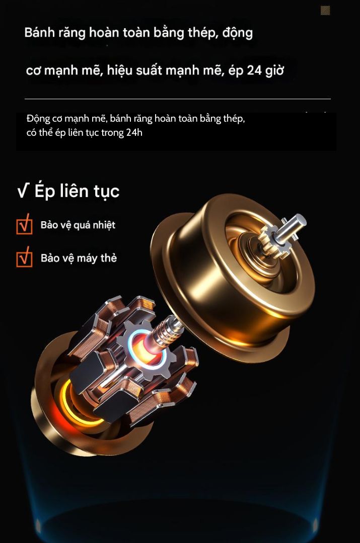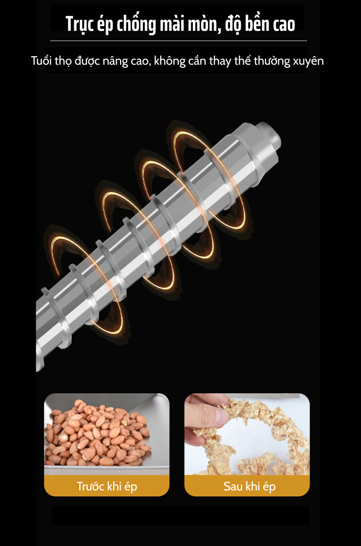 Hiệu quả ép lên đến 99%: Đảm bảo ép kiệt dầu trong một lần sử dụng, tiết kiệm tối đa nguyên liệu, bã sau ép khô ráo và có thể tái sử dụng nấu cháo, làm bánh hoặc làm thức ăn chăn nuôi.