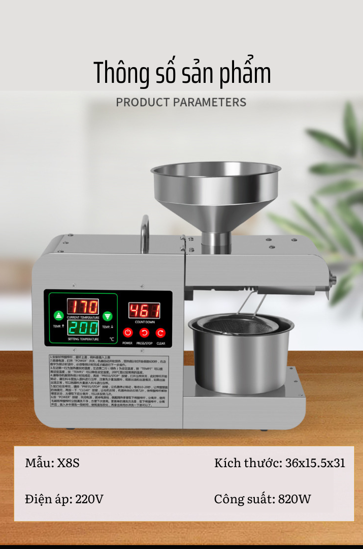 Máy ép dầu thực vật X8S là lựa chọn lý tưởng cho những ai mong muốn tự tay làm ra dầu ăn sạch, nguyên chất từ thiên nhiên. Sản phẩm không chỉ giúp bạn kiểm soát hoàn toàn nguyên liệu, mà còn giúp tiết kiệm chi phí mua dầu ngoài thị trường – nhất là với các loại dầu cao cấp như mè đen, óc chó, hạnh nhân, macca...