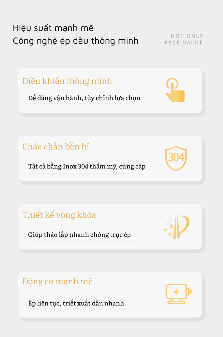 Không cần kỹ thuật phức tạp, chỉ với vài thao tác đơn giản, chiếc máy nhỏ gọn này sẽ mang lại những chai dầu nguyên chất thơm ngon, an toàn, không chất bảo quản, không hóa chất độc hại. Một khoản đầu tư thông minh – xứng đáng cho sức khỏe của cả gia đình bạn.