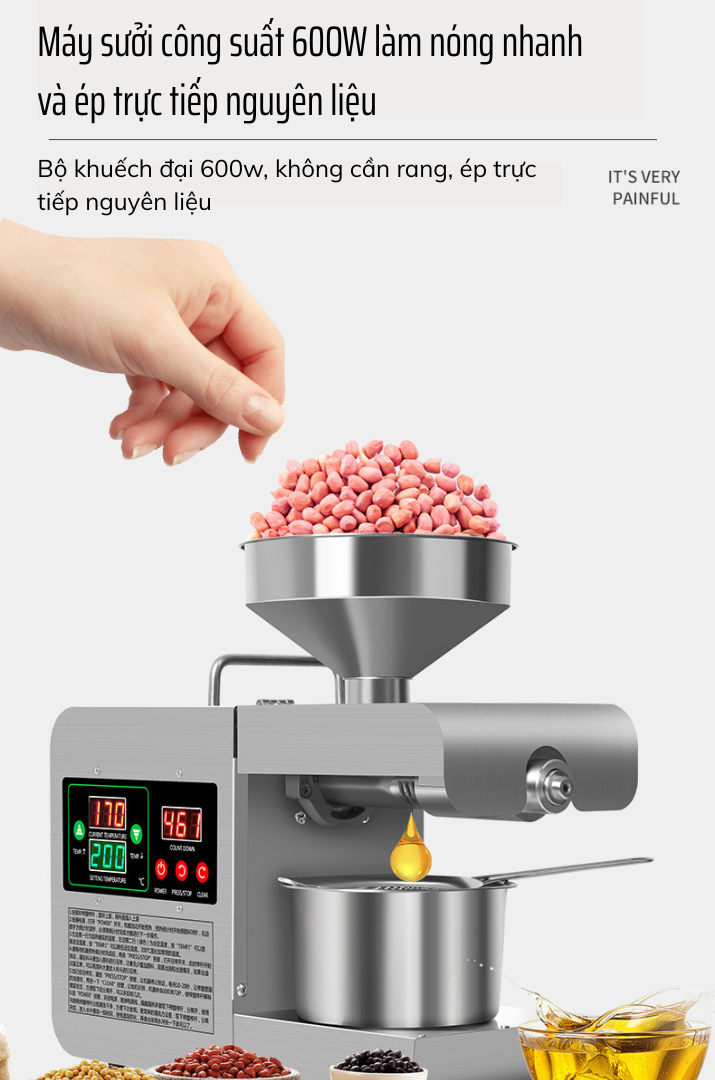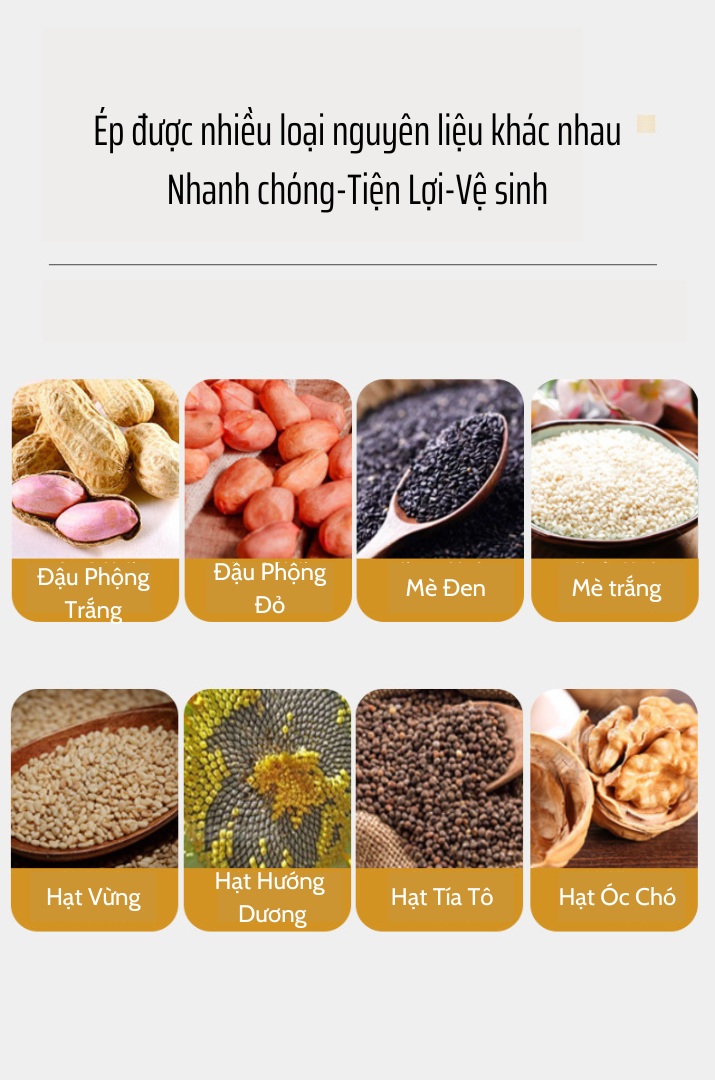 Ép được nhiều loại hạt mà không cần rang: Dầu ép ra nguyên chất, giữ trọn dinh dưỡng nhờ cơ chế gia nhiệt trực tiếp kết hợp trục xoắn ép mạnh. Dù là lạc, mè, óc chó hay dừa khô… máy đều xử lý gọn gàng.