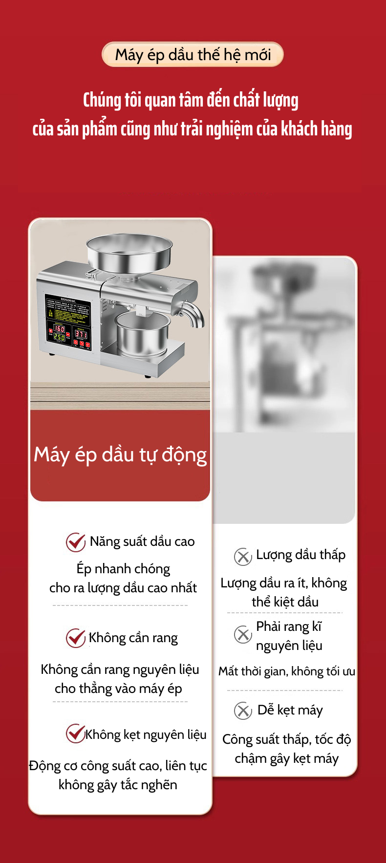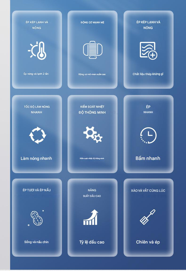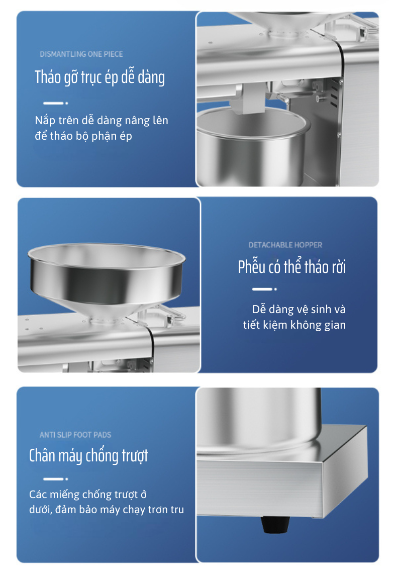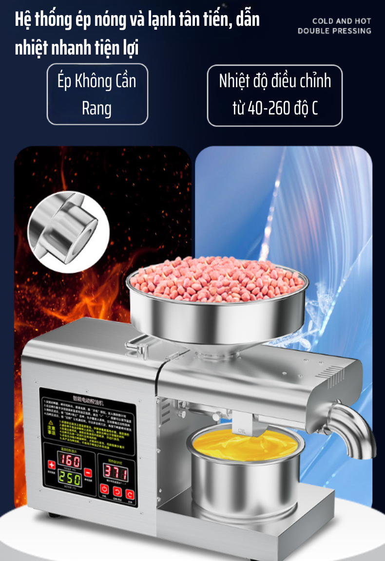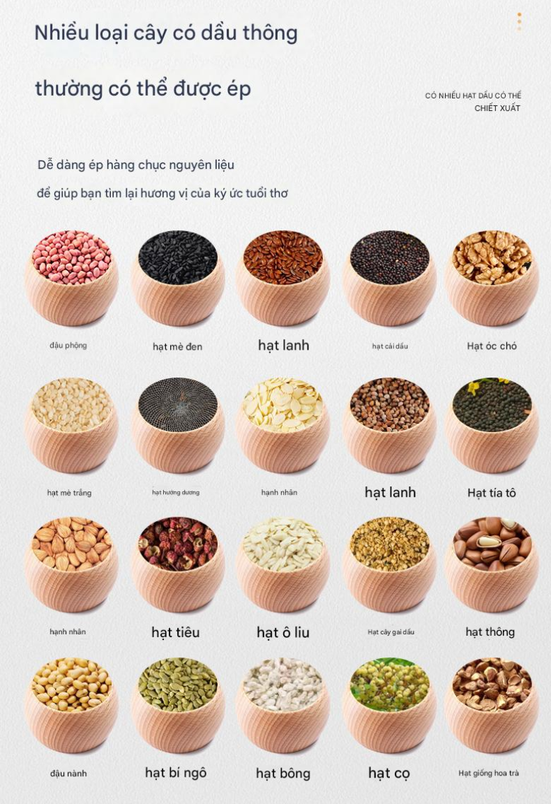 Không cần rang nguyên liệu trước khi ép: Giúp tiết kiệm thời gian và giữ nguyên hương vị tinh khiết của dầu thực vật.