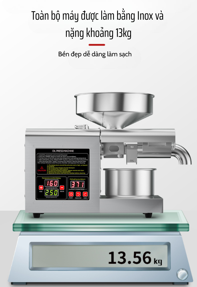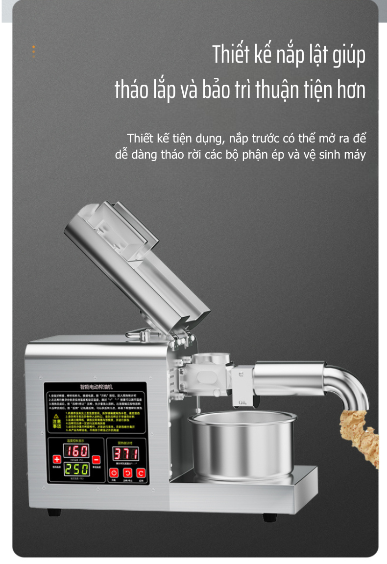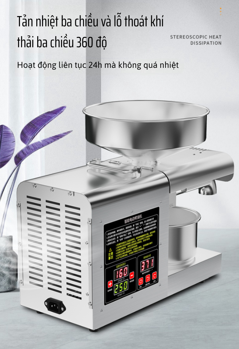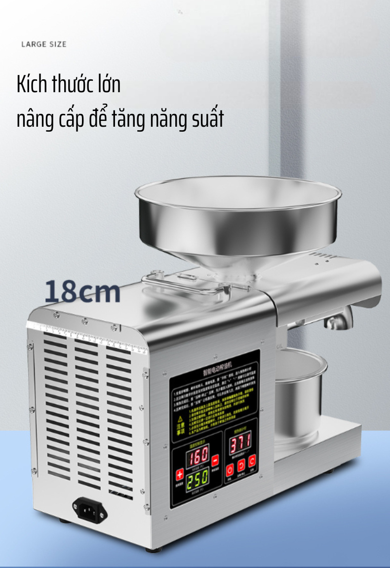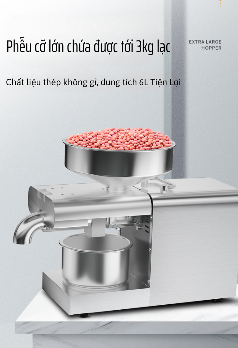 Công suất ép cực đại 1200W: Cho khả năng ép mạnh mẽ, hoạt động liên tục mà không lo nóng máy, phục vụ ép dầu liên tục nhiều mẻ trong ngày.