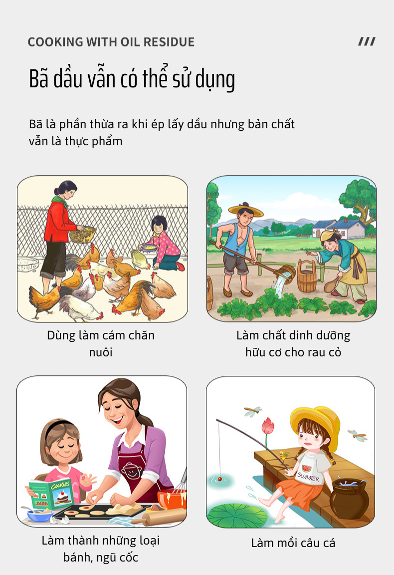 Sau quá trình ép, phần bã có thể tận dụng làm nguyên liệu nấu cháo, làm bánh, kho cá, hoặc làm thức ăn chăn nuôi rất tiện lợi và dinh dưỡng.