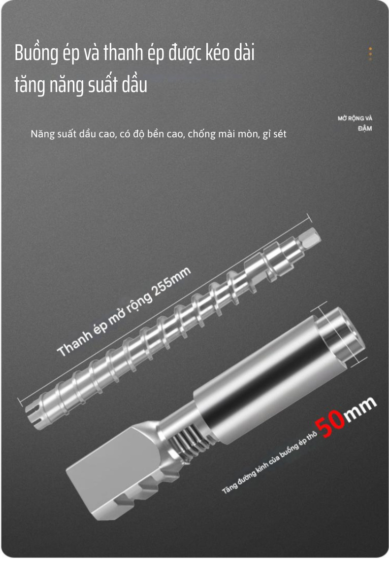 Trục ép dài 255mm bằng inox 420 cao cấp: Thiết kế dạng xoắn tháp giúp ép mạnh, kiệt dầu hơn. Trục dễ tháo lắp và vệ sinh.