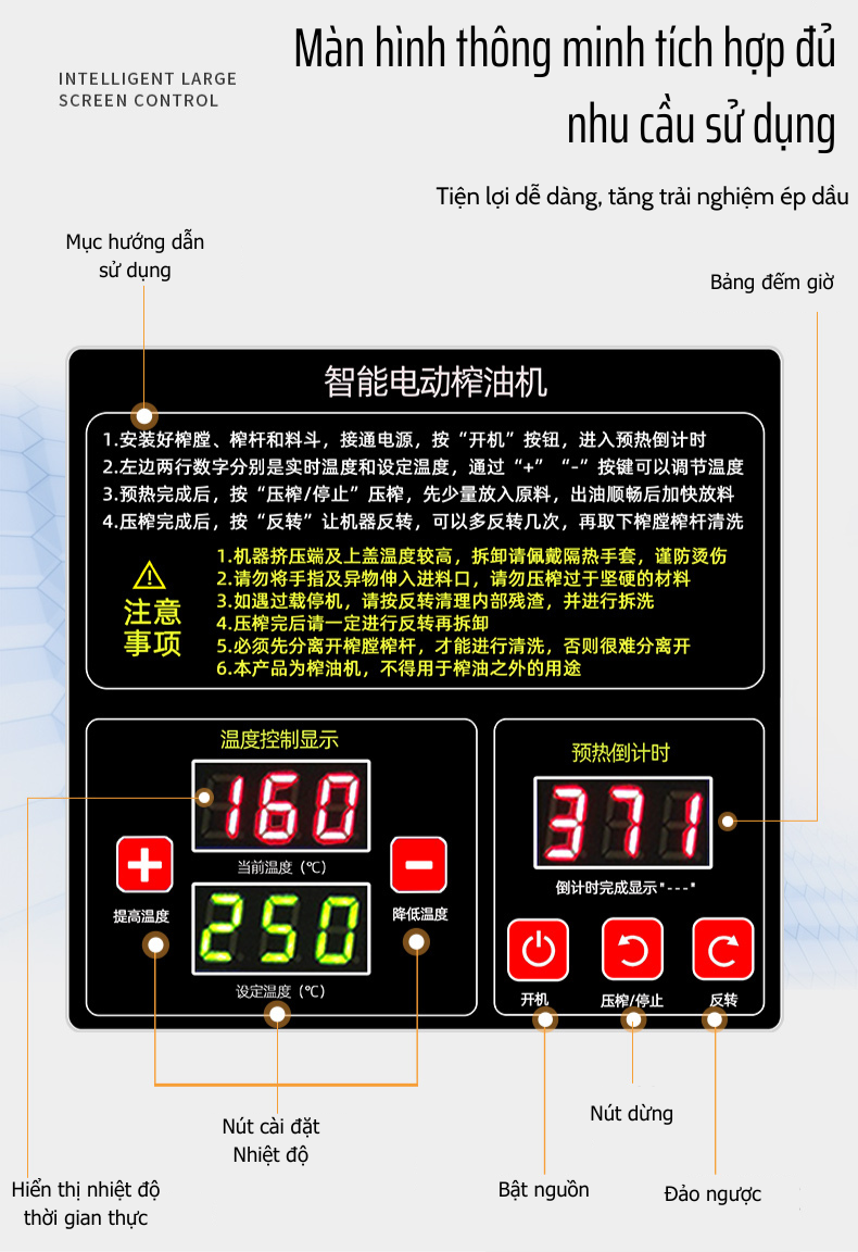 Hệ thống điều khiển hiện đại: Màn hình kỹ thuật số hiển thị rõ ràng, dễ dàng điều chỉnh nhiệt độ phù hợp với từng loại hạt.