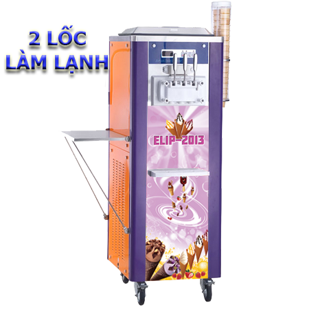 Máy Elip 2013 có 2 ngăn chứa kem để bạn có thể làm đồng thời 2 hương vị kem khác nhau với 3 vòi lấy kem sử dụng đơn giản, tạo hình xoắn ốc cho ly kem đẹp mắt.
