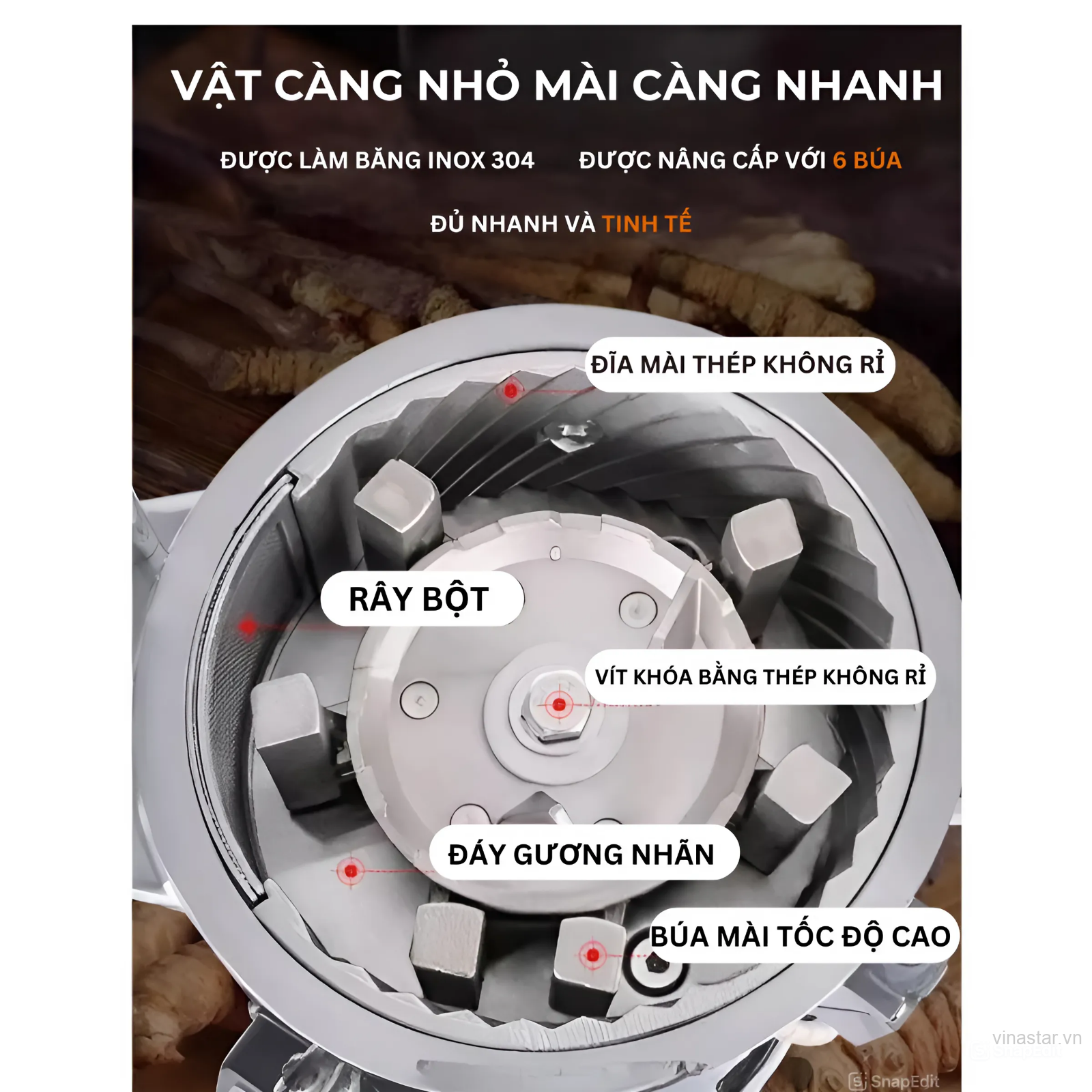 - Thiết kế 6 búa mài: Tăng hiệu quả nghiền, tạo ra bột mịn đều.