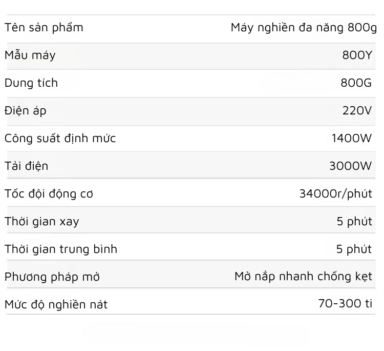 - Dung tích lớn: Cối xay 800g cho phép bạn chế biến một lượng lớn nguyên liệu mỗi lần xay, tiết kiệm thời gian và công sức.
