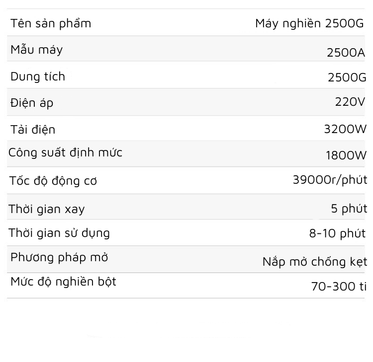 - Khối lượng xay lớn: Khả năng xay một lần lên đến 2500g giúp tiết kiệm thời gian và công sức.