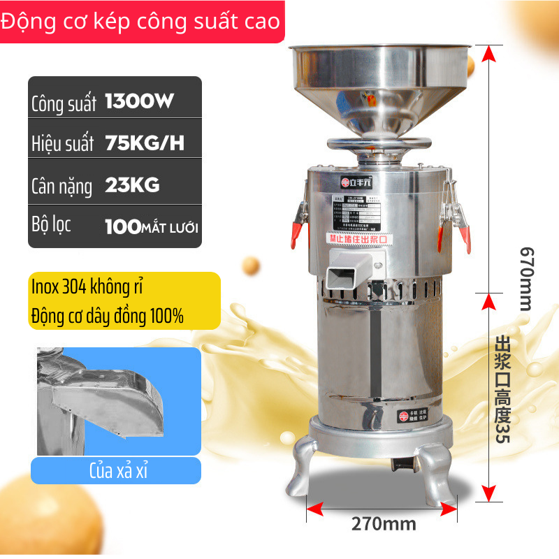 Máy xay đậu nành tách bã của Công ty Vinastar sử dụng động cơ có công suất 750W, nguồn điện gia đình 220V an toàn. Chân máy được làm bằng gang đúc nguyên khối chắc chắn có vai trò nâng đỡ và bảo vệ máy, giúp máy đứng vững, vận hành ổn định, phát ra tiếng ồn thấp, tiết kiệm điện năng tiêu thụ, phù hợp với không gian gia đình.